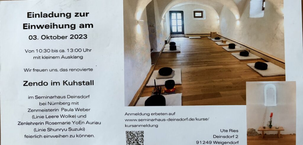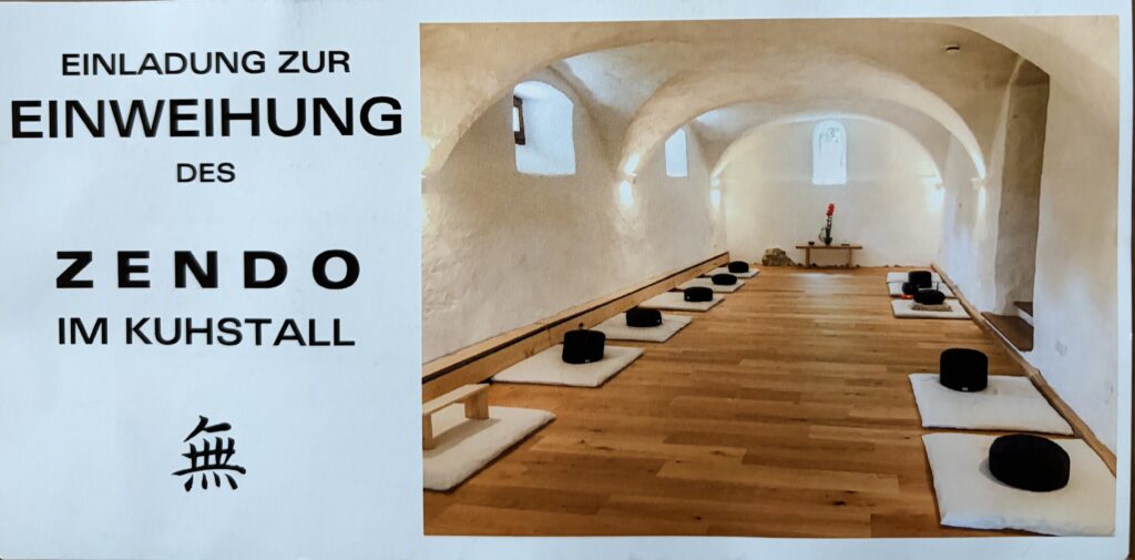Das Zendo Mu wurde am dritten Oktober 2023 feierlich eingeweiht, damals noch unter dem Namen „Zendo im Kuhstall“. Eingeweiht wurde es von der Zenmeisterin Paula Weber (Linie Leere Wolke) und der Zenlehrerin Rosemarie YoEn Auriau (Linie Shunryu Suzuki).